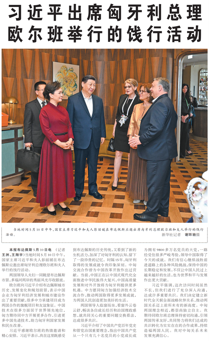 当地时间5月10日中午,国家主席习近平和夫人彭丽媛在布达佩斯应邀出席匈牙利总理欧尔班和夫人举行的饯行活动。(今日《人民日报》1版)