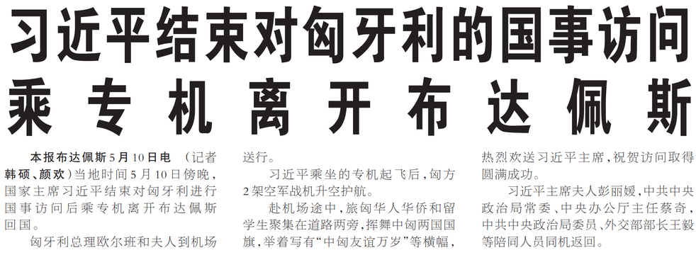当地时间5月10日傍晚,国家主席习近平结束对匈牙利进行国事访问后乘专机离开布达佩斯回国。(今日《人民日报》1版)
