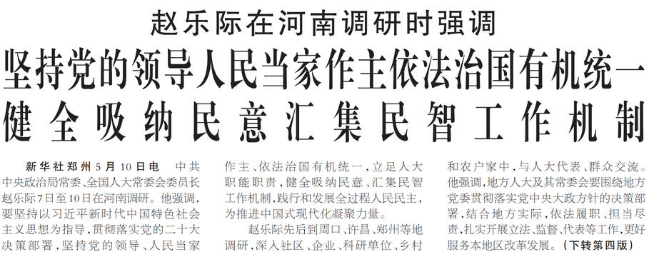中共中央政治局常委、全国人大常委会委员长赵乐际7日至10日在河南调研。他强调,要坚持以习近平新时代中国特色社会主义思想为指导,贯彻落实党的二十大决策部署,坚持党的领导、人民当家作主、依法治国有机统一,立足人大职能职责,健全吸纳民意、汇集民智工作机制,践行和发展全过程人民民主,为推进中国式现代化凝聚力量。(今日《人民日报》1版、4版)