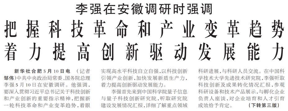 中共中央政治局常委、国务院总理李强5月10日在安徽调研。他强调,要深入贯彻习近平总书记关于科技创新和产业创新的重要指示精神,把握新一轮科技革命和产业变革趋势,着眼实现高水平科技自立自强,以科技创新引领产业创新,加快发展新质生产力,着力提高创新驱动发展能力。(今日《人民日报》1版、3版)