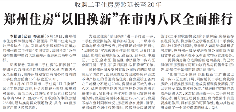 5月10日,由郑州市住房保障和房地产管理局、郑州市住宅与房地产业协会主办,郑州城发安居有限公司承办的郑州市二手住房“卖旧买新、以旧换新”公告发布暨集中签约仪式在郑州市房屋交易中心举行。(今日《河南日报》2版)