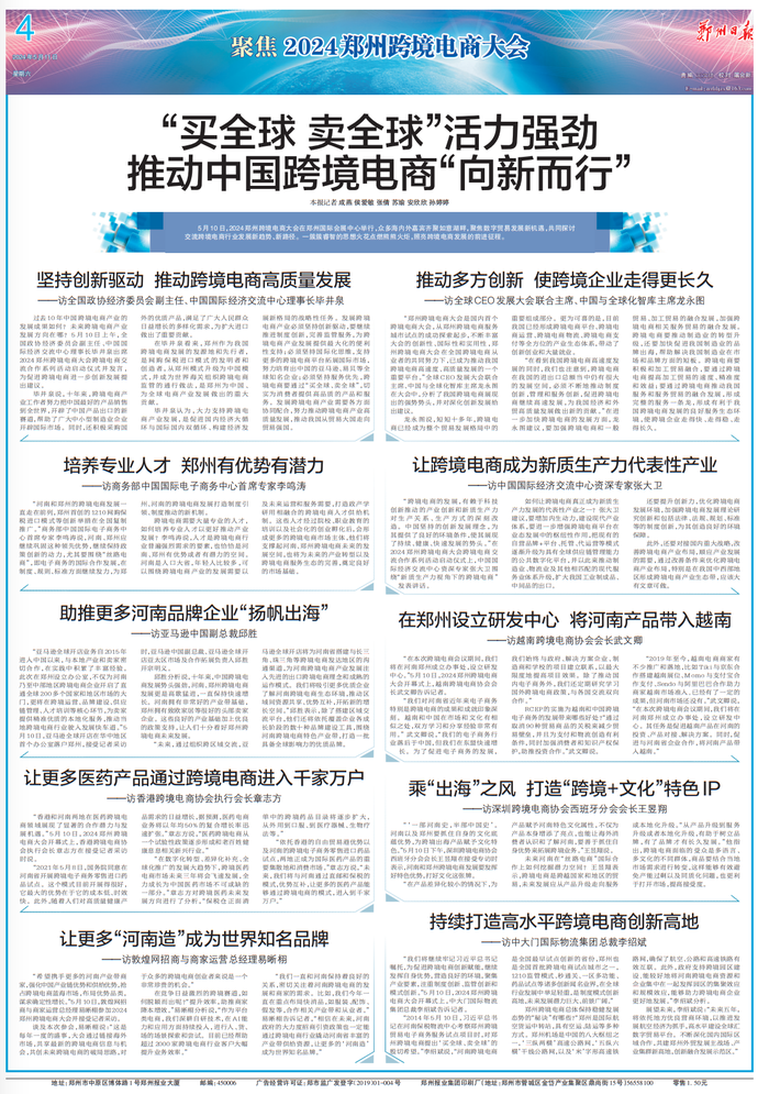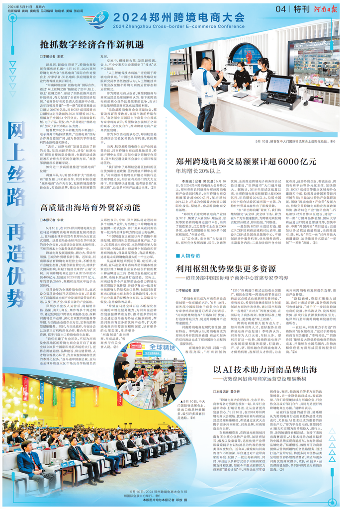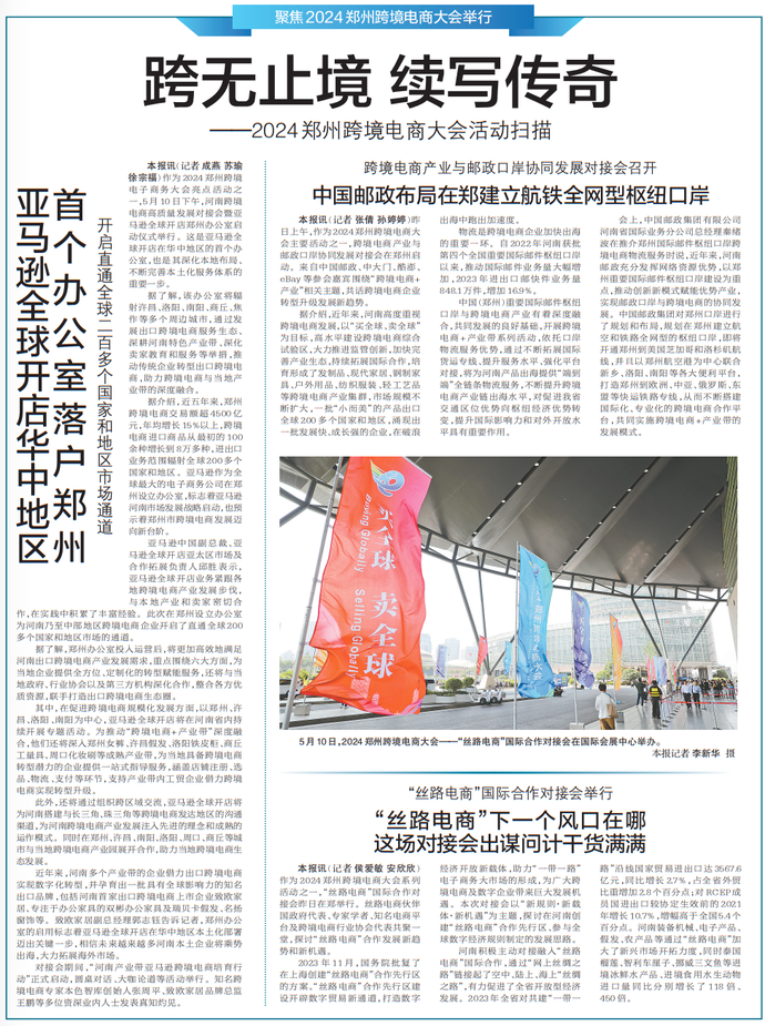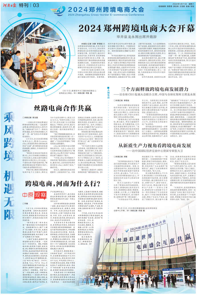 新规则、新载体背景下,跨境电商发展有哪些新机遇?5月10日,2024郑州跨境电商大会“丝路电商”国际合作对接会上,专家学者、知名电商、供应链服务企业代表等就此展开研讨。(今日《河南日报》4版)