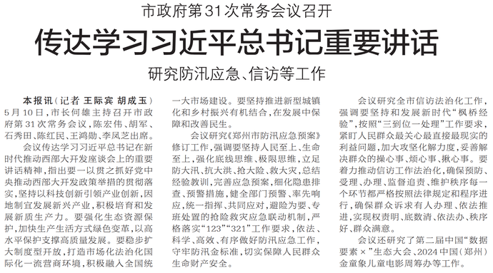 5月10日,市长何雄主持召开市政府第31次常务会议,陈宏伟、胡军、石秀田、陈红民、王鸿勋、李凤芝出席。(今日《郑州日报》1版)