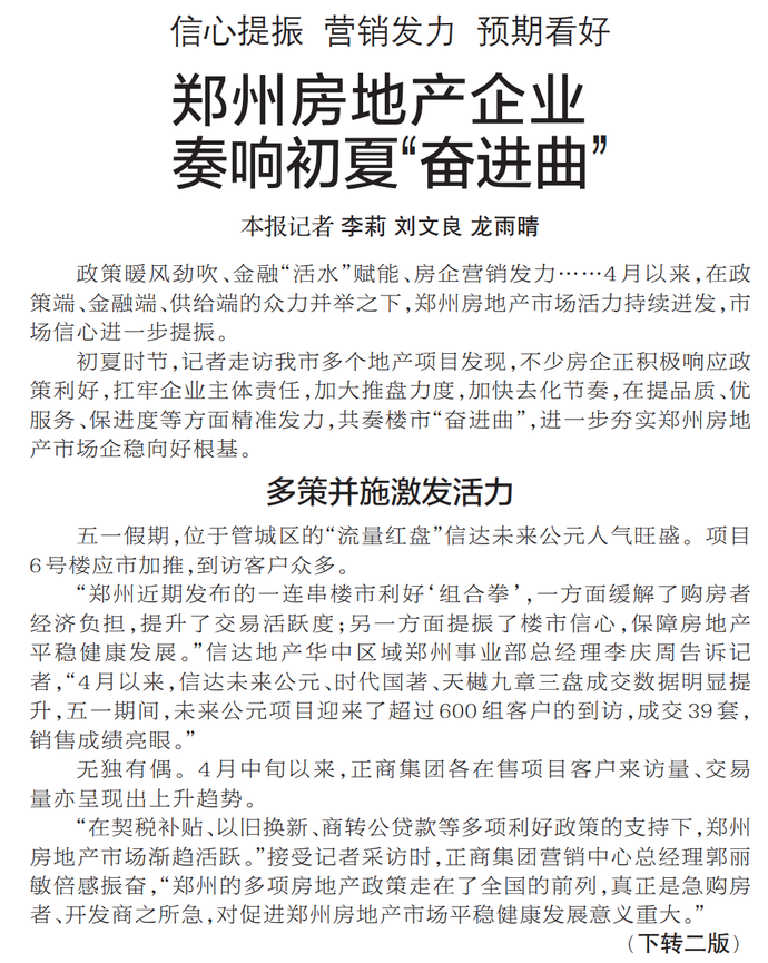 政策暖风劲吹、金融“活水”赋能、房企营销发力……4月以来,在政策端、金融端、供给端的众力并举之下,郑州房地产市场活力持续迸发,市场信心进一步提振。(今日《郑州日报》1版、2版)
