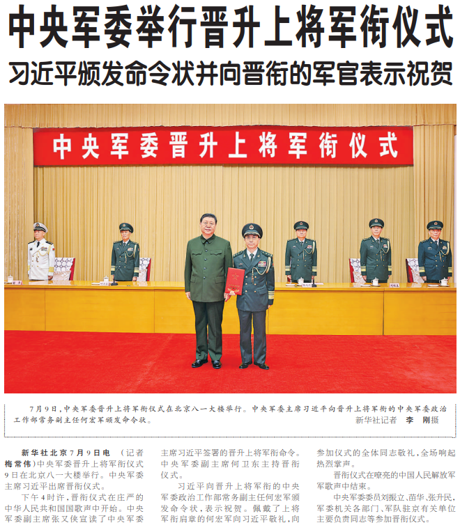 中央军委晋升上将军衔仪式9日在北京八一大楼举行。中央军委主席习近平出席晋衔仪式。(今日《人民日报》1版)