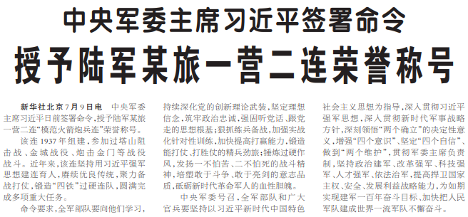中央军委主席习近平日前签署命令,授予陆军某旅一营二连“模范火箭炮兵连”荣誉称号。(今日《人民日报》1版)