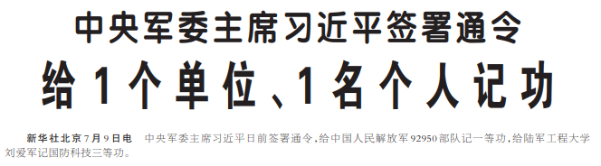中央军委主席习近平日前签署通令,给中国人民解放军92950部队记一等功,给陆军工程大学刘爱军记国防科技三等功。(今日《人民日报》1版)