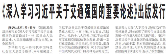 交通运输部组织编写的《深入学习习近平关于交通强国的重要论述》一书,近日由人民出版社、人民交通出版社联合出版,在全国发行。(今日《人民日报》1版)