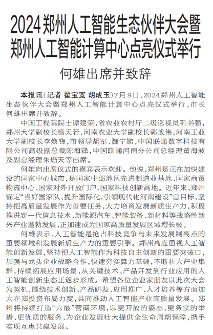 7月9日,2024郑州人工智能生态伙伴大会暨郑州人工智能计算中心点亮仪式举行,市长何雄出席并致辞。