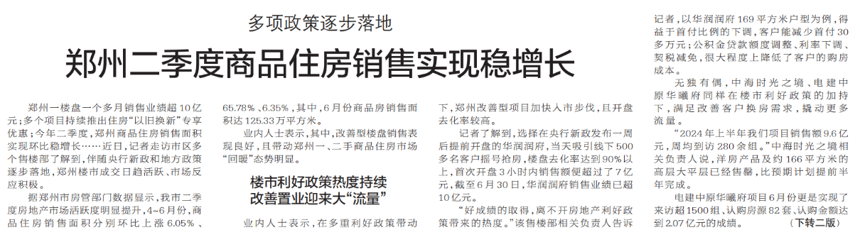 郑州一楼盘一个多月销售业绩超10亿元;多个项目持续推出住房“以旧换新”专享优惠;今年二季度,郑州商品住房销售面积实现环比稳增长……近日,记者走访市区多个售楼部了解到,伴随央行新政和地方政策逐步落地,郑州楼市成交日趋活跃、市场反应积极。(今日《郑州日报》1版、2版)