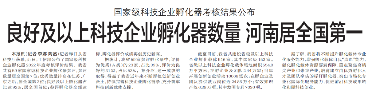 良好及以上科技企业孵化器数量 河南居全国第一
