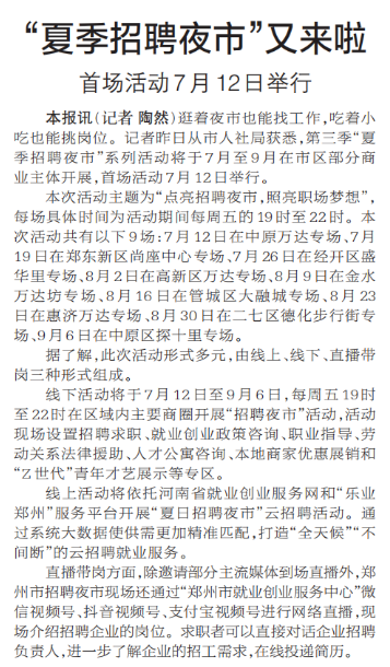 逛着夜市也能找工作,吃着小吃也能挑岗位。记者昨日从市人社局获悉,第三季“夏季招聘夜市”系列活动将于7月至9月在市区部分商业主体开展,首场活动7月12日举行。(今日《郑州日报》2版)