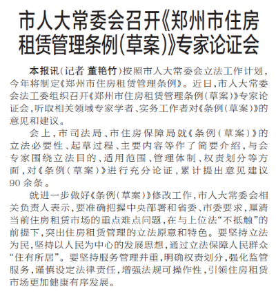按照市人大常委会立法工作计划,今年将制定《郑州市住房租赁管理条例》。近日,市人大常委会法工委组织召开《郑州市住房租赁管理条例(草案)》专家论证会,听取相关领域专家学者、实务工作者对《条例(草案)》的意见和建议。(今日《郑州日报》2版)