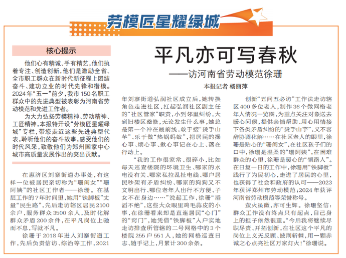 为大力弘扬劳模精神、劳动精神、工匠精神,本报特开设“劳模匠星耀绿城”专栏,带您走近这些先进典型代表,聆听他们的奋斗故事,感受他们的时代风采,致敬他们为郑州国家中心城市高质量发展作出的突出贡献。