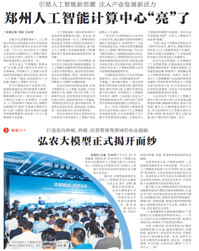 7月9日,在“中部崛起·智领未来”2024郑州人工智能生态伙伴大会暨郑州人工智能计算中心点亮仪式上,河南农业大学和科大讯飞河南人工智能产业研究院共同研发的弘农大模型正式启动。(今日《河南日报》2版)