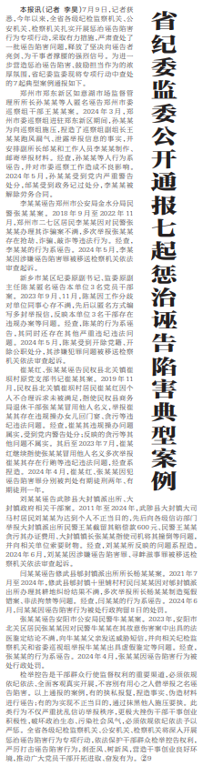 7月9日,记者获悉,今年以来,全省各级纪检监察机关、公安机关、检察机关扎实开展惩治诬告陷害行为专项行动,采取有力措施,严肃查处了一批诬告陷害问题,释放了坚决向诬告者亮剑、为干事者撑腰的强烈信号。为进一步营造惩治诬告陷害、鼓励担当作为的浓厚氛围,省纪委监委现将专项行动中查处的7起典型案例通报如下。(今日《河南日报》4版)