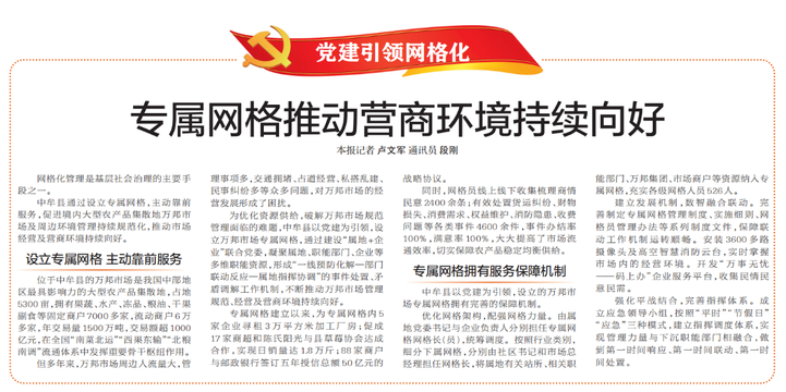 中牟县通过设立专属网格,主动靠前服务,促进境内大型农产品集散地万邦市场及周边环境管理持续规范化,推动市场经营及营商环境持续向好。(今日《郑州日报》7版)