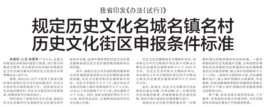 7月9日,记者从河南省住房和城乡建设厅获悉,该厅联合河南省文物局,结合我省实际印发《河南省历史文化名城名镇名村和历史文化街区申报管理办法(试行)》。(今日《郑州日报》8版)