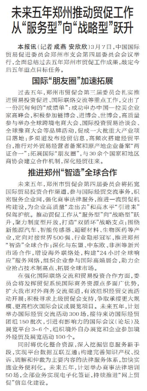 3月7日,中国国际贸易促进委员会郑州市支会第四届委员会会议举行,全面总结过去五年郑州市贸促工作成果,敲定今后五年重点目标任务。(今日《郑州日报》2版)