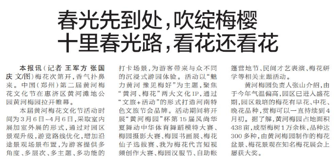 梅花次第开,香气扑鼻来。中国(郑州)第二届黄河梅花文化节在惠济区黄河滩地公园黄河梅园拉开帷幕。(今日《郑州日报》2版)