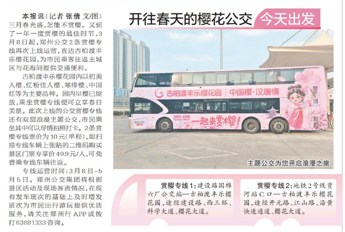 三月春光盛,怎能不赏樱。又到了一年一度赏樱的最佳时节,3月8日起,郑州公交2条赏樱专线再次上线运营,直达古柏渡丰乐樱花园,为市民乘客往返主城区与花海间提供交通便利。(今日《郑州日报》2版)