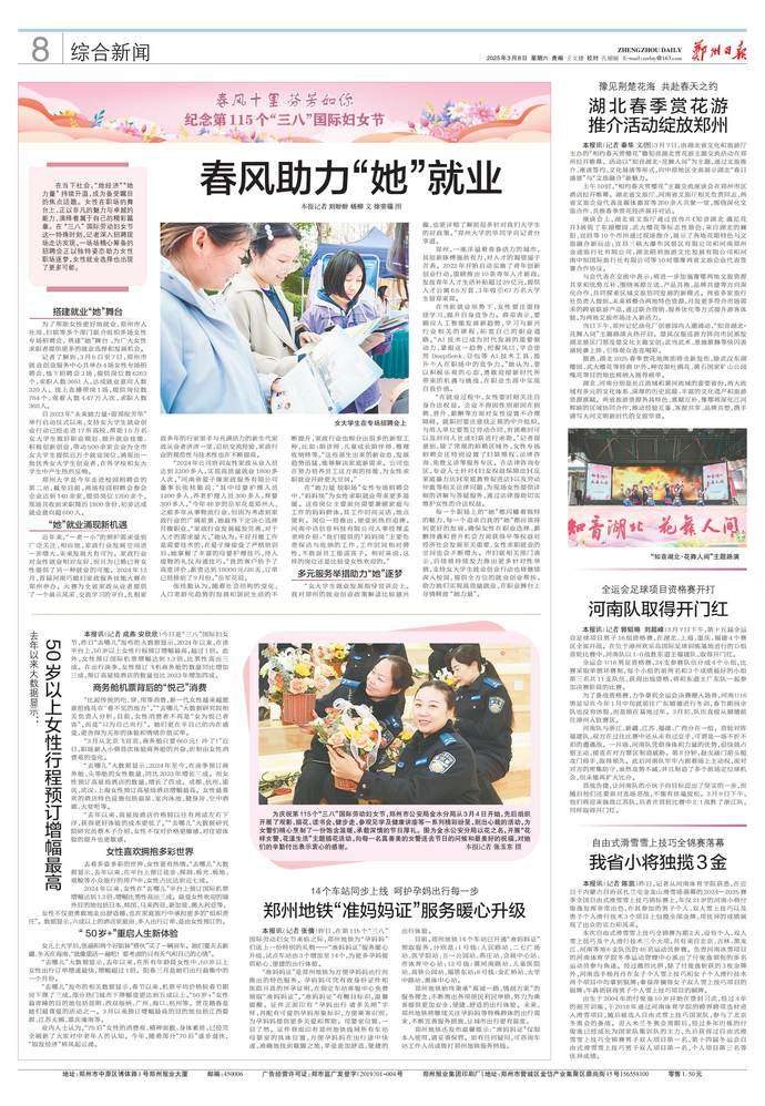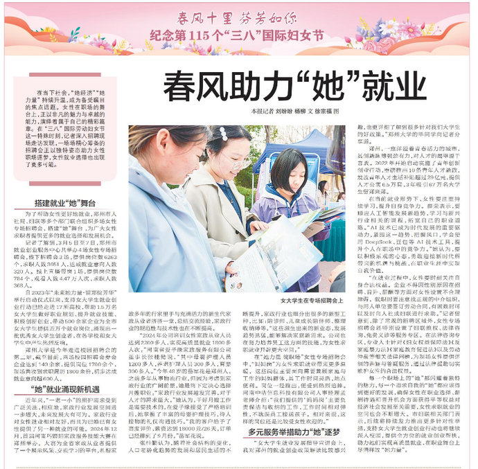 在当下社会,“她经济”“她力量” 持续升温,成为备受瞩目的焦点话题。女性在职场的舞台上,正以非凡的魅力与卓越的能力,演绎着属于自己的精彩篇章。在 “三八” 国际劳动妇女节这一特殊时刻,记者深入招聘现场走访发现,一场场精心筹备的招聘会正以独特姿态助力女性职场逐梦,女性就业选择也出现了更多可能。(今日《郑州日报》8版)