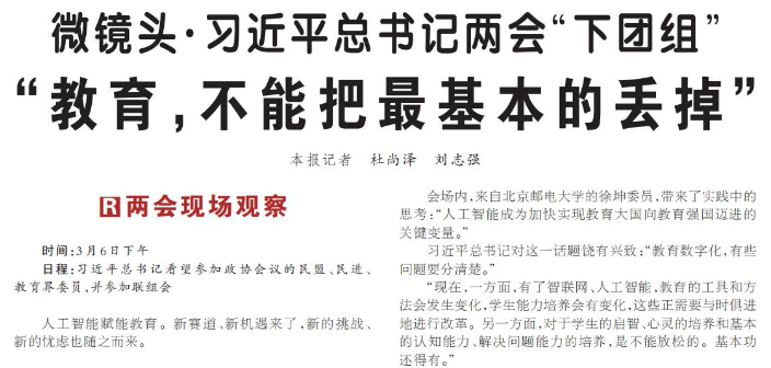 会场内,来自北京邮电大学的徐坤委员,带来了实践中的思考:“人工智能成为加快实现教育大国向教育强国迈进的关键变量。”(今日《人民日报》1版、2版)