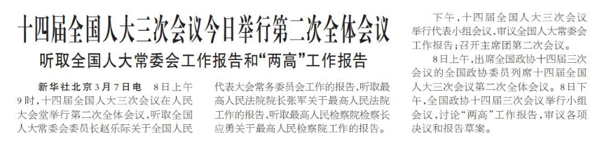 8日上午9时,十四届全国人大三次会议在人民大会堂举行第二次全体会议,听取全国人大常委会委员长赵乐际关于全国人民代表大会常务委员会工作的报告,听取最高人民法院院长张军关于最高人民法院工作的报告,听取最高人民检察院检察长应勇关于最高人民检察院工作的报告。(今日《人民日报》1版)
