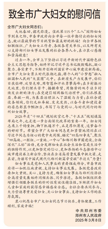大地春回,韶光弥漫。值此第115个“三八”国际妇女节到来之际,市委市政府向全市每一位辛勤付出的妇女同志,致以最诚挚的节日祝贺和最美好的祝福!向全市各级妇联组织、广大妇女工作者、各级各有关单位,以及所有关心支持郑州妇女事业发展的社会各界人士,表示衷心感谢和崇高敬意!(今日《郑州日报》1版、2版)