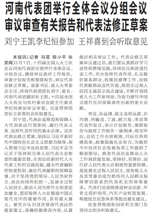 3月7日,十四届全国人大三次会议河南代表团分别举行全体会议、分组会议,继续审议政府工作报告,审查计划报告和预算报告,审议代表法修正草案。省委书记、省人大常委会主任、河南代表团团长刘宁,省长、河南代表团副团长王凯,十四届全国人大农业与农村委员会副主任委员李纪恒参加审议审查。应急管理部部长王祥喜到会听取意见。(今日《河南日报》1版)