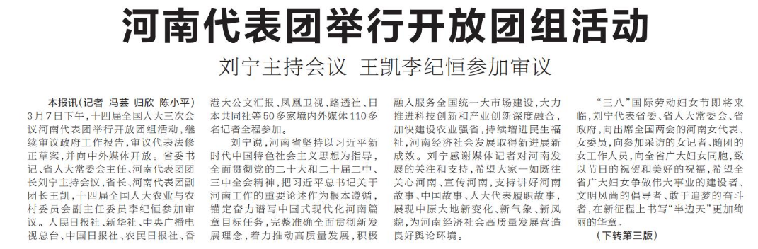 3月7日下午,十四届全国人大三次会议河南代表团举行开放团组活动,继续审议政府工作报告,审议代表法修正草案,并向中外媒体开放。省委书记、省人大常委会主任、河南代表团团长刘宁主持会议,省长、河南代表团副团长王凯,十四届全国人大农业与农村委员会副主任委员李纪恒参加审议。人民日报社、新华社、中央广播电视总台、中国日报社、农民日报社、香港大公文汇报、凤凰卫视、路透社、日本共同社等50多家境内外媒体110多名记者全程参加。(今日《河南日报》1版、3版)