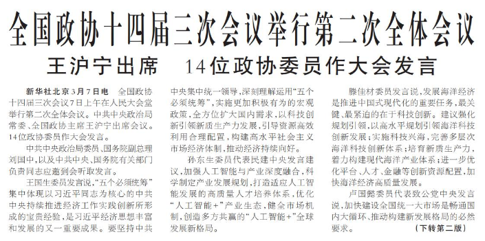 全国政协十四届三次会议7日上午在人民大会堂举行第二次全体会议。中共中央政治局常委、全国政协主席王沪宁出席会议。14位政协委员作大会发言。(今日《人民日报》1版、2版)