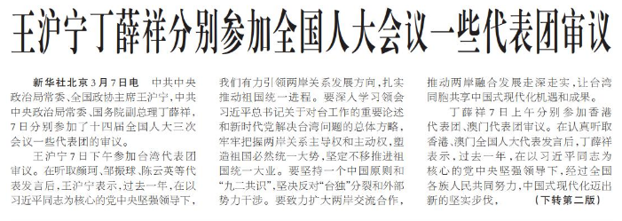 中共中央政治局常委、全国政协主席王沪宁,中共中央政治局常委、国务院副总理丁薛祥,7日分别参加了十四届全国人大三次会议一些代表团的审议。(今日《人民日报》1版、2版)