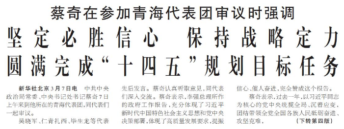 中共中央政治局常委、中央书记处书记蔡奇7日上午来到他所在的青海代表团,同代表们一起审议。(今日《人民日报》1版、4版)