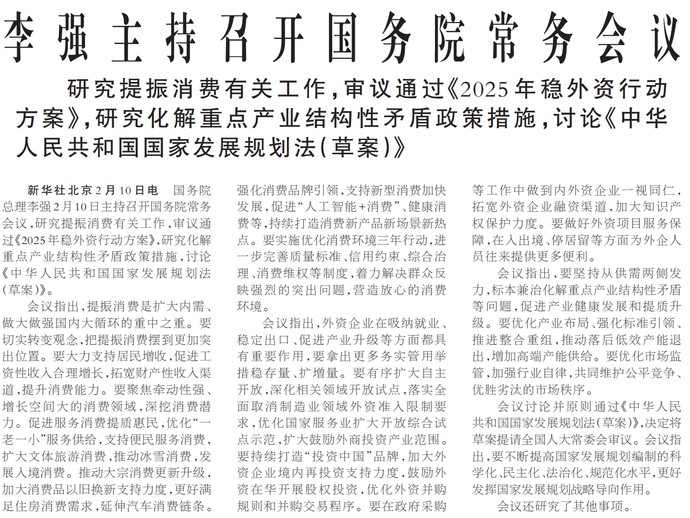 国务院总理李强2月10日主持召开国务院常务会议,研究提振消费有关工作,审议通过《2025年稳外资行动方案》,研究化解重点产业结构性矛盾政策措施,讨论《中华人民共和国国家发展规划法(草案)》。(今日《人民日报》1版)