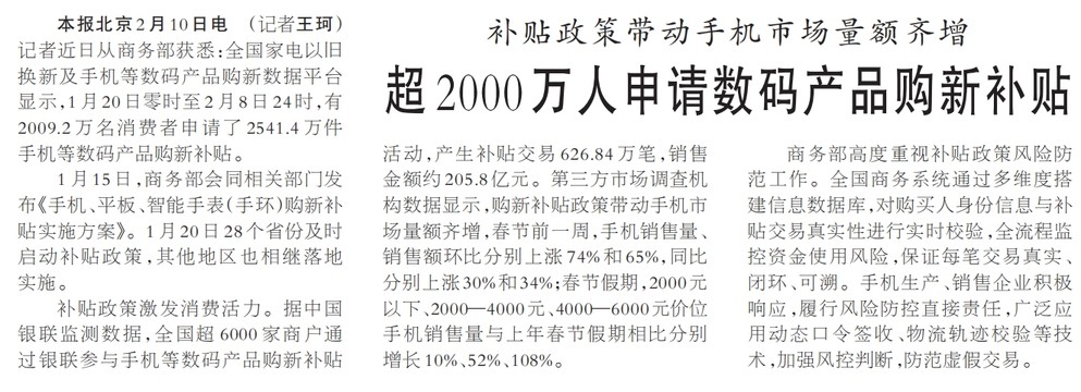 记者近日从商务部获悉:全国家电以旧换新及手机等数码产品购新数据平台显示,1月20日零时至2月8日24时,有2009.2万名消费者申请了2541.4万件手机等数码产品购新补贴。(今日《人民日报》1版)