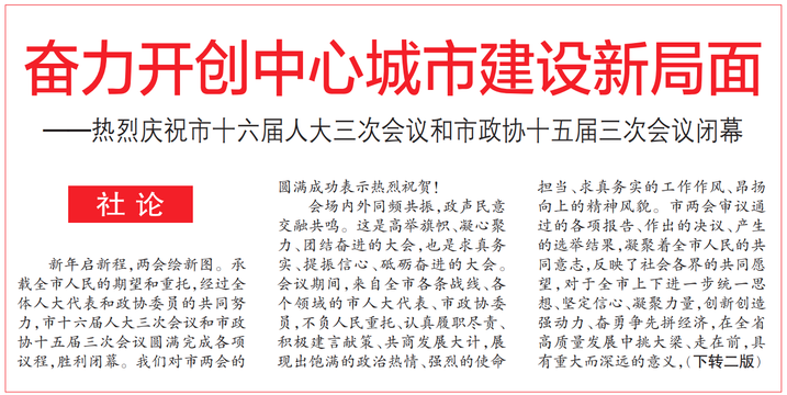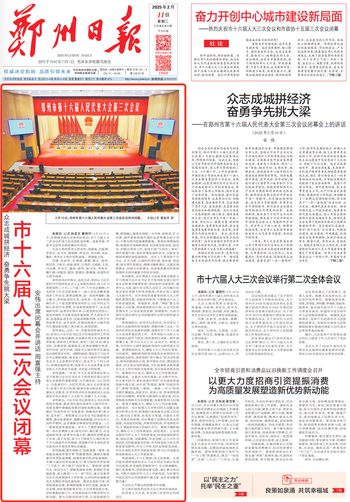 新年启新程,两会绘新图。承载全市人民的期望和重托,经过全体人大代表和政协委员的共同努力,市十六届人大三次会议和市政协十五届三次会议圆满完成各项议程,胜利闭幕。我们对市两会的圆满成功表示热烈祝贺!(今日《郑州日报》1版、2版)