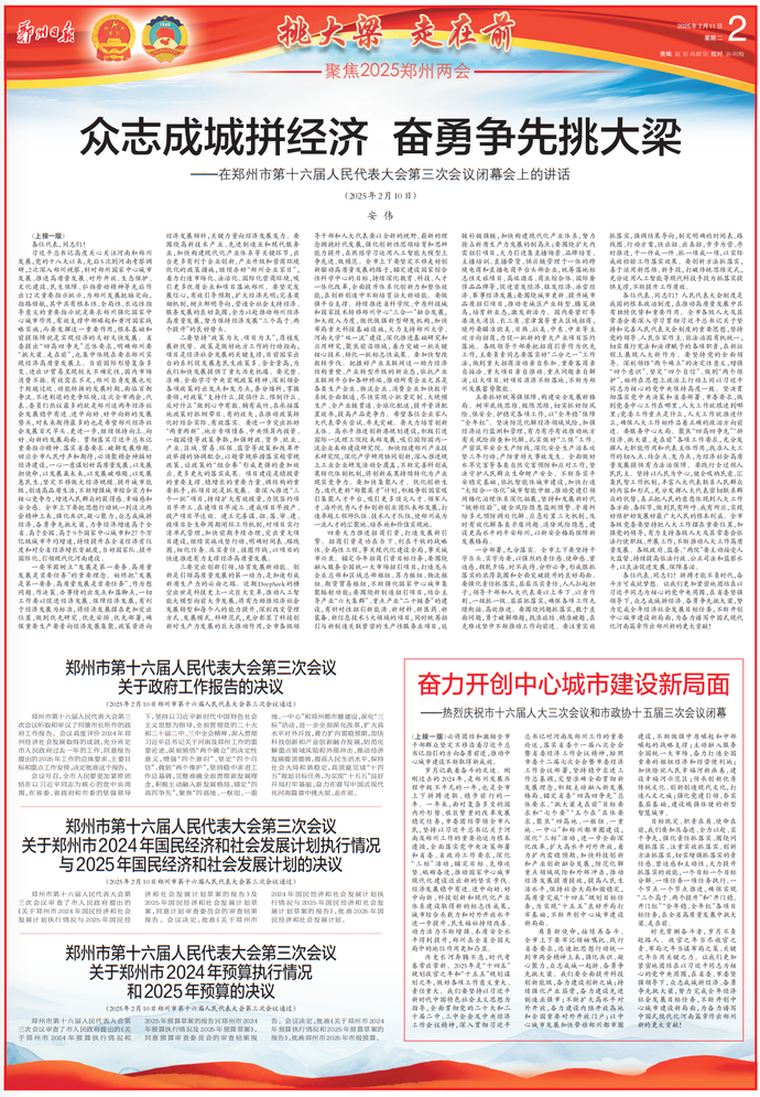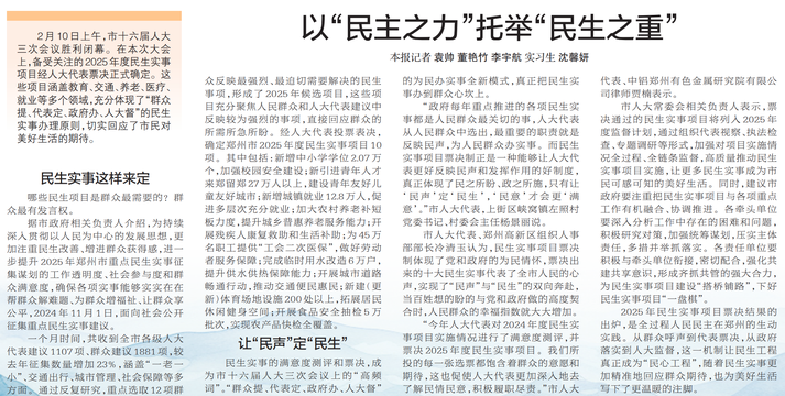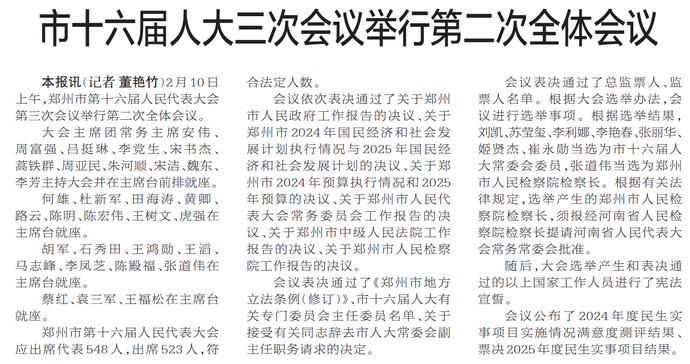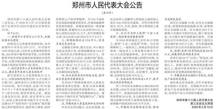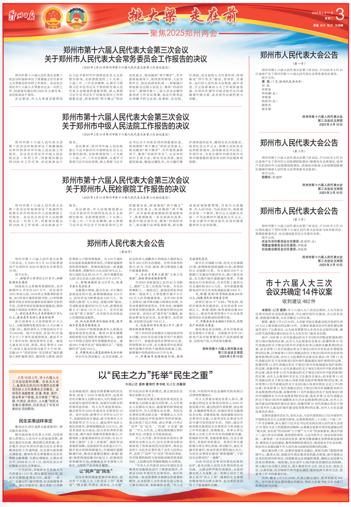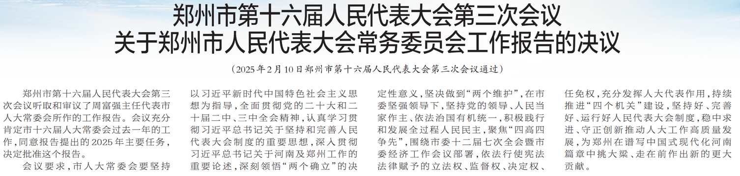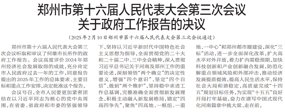 郑州市第十六届人民代表大会第三次会议,于2025年2月10日投票表决产生郑州市2025年度民生实事项目10项。(今日《郑州日报》3版)