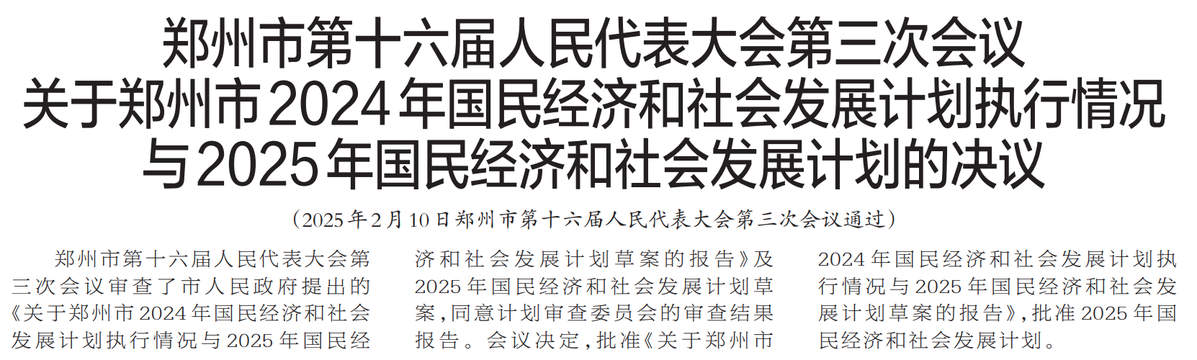 郑州市第十六届人民代表大会第三次会议审查了市人民政府提出的《关于郑州市2024年国民经济和社会发展计划执行情况与2025年国民经济和社会发展计划草案的报告》及2025年国民经济和社会发展计划草案,同意计划审查委员会的审查结果报告。会议决定,批准《关于郑州市2024年国民经济和社会发展计划执行情况与2025年国民经济和社会发展计划草案的报告》,批准2025年国民经济和社会发展计划。(今日《郑州日报》2版)