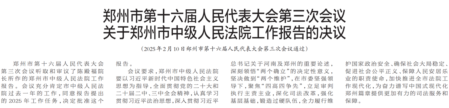 郑州市第十六届人民代表大会第三次会议听取和审议了陈殿福院长所作的郑州市中级人民法院工作报告。会议充分肯定市中级人民法院过去一年的工作,同意报告提出的2025年工作任务,决定批准这个报告。(今日《郑州日报》3版)