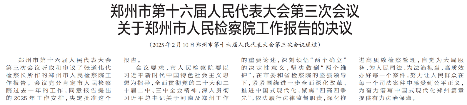 郑州市第十六届人民代表大会第三次会议听取和审议了张道伟代检察长所作的郑州市人民检察院工作报告。会议充分肯定市人民检察院过去一年的工作,同意报告提出的2025年工作安排,决定批准这个报告。(今日《郑州日报》3版)