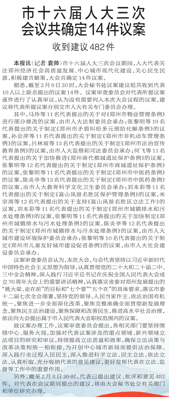 市十六届人大三次会议期间,人大代表关注郑州经济社会高质量发展、中心城市现代化建设,关心民生民意,积极建言献策,大会共确定14件议案。(今日《郑州日报》3版)