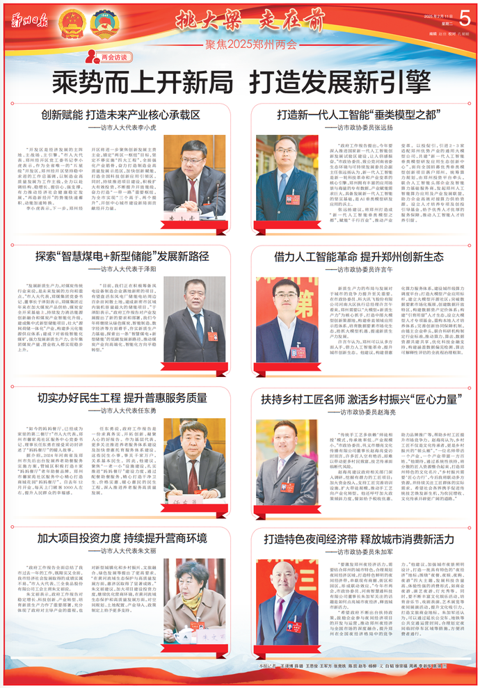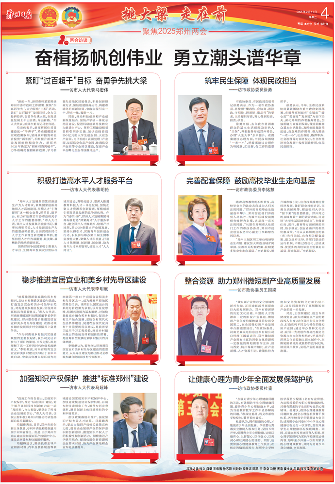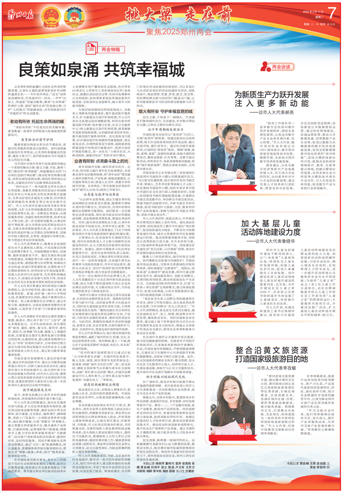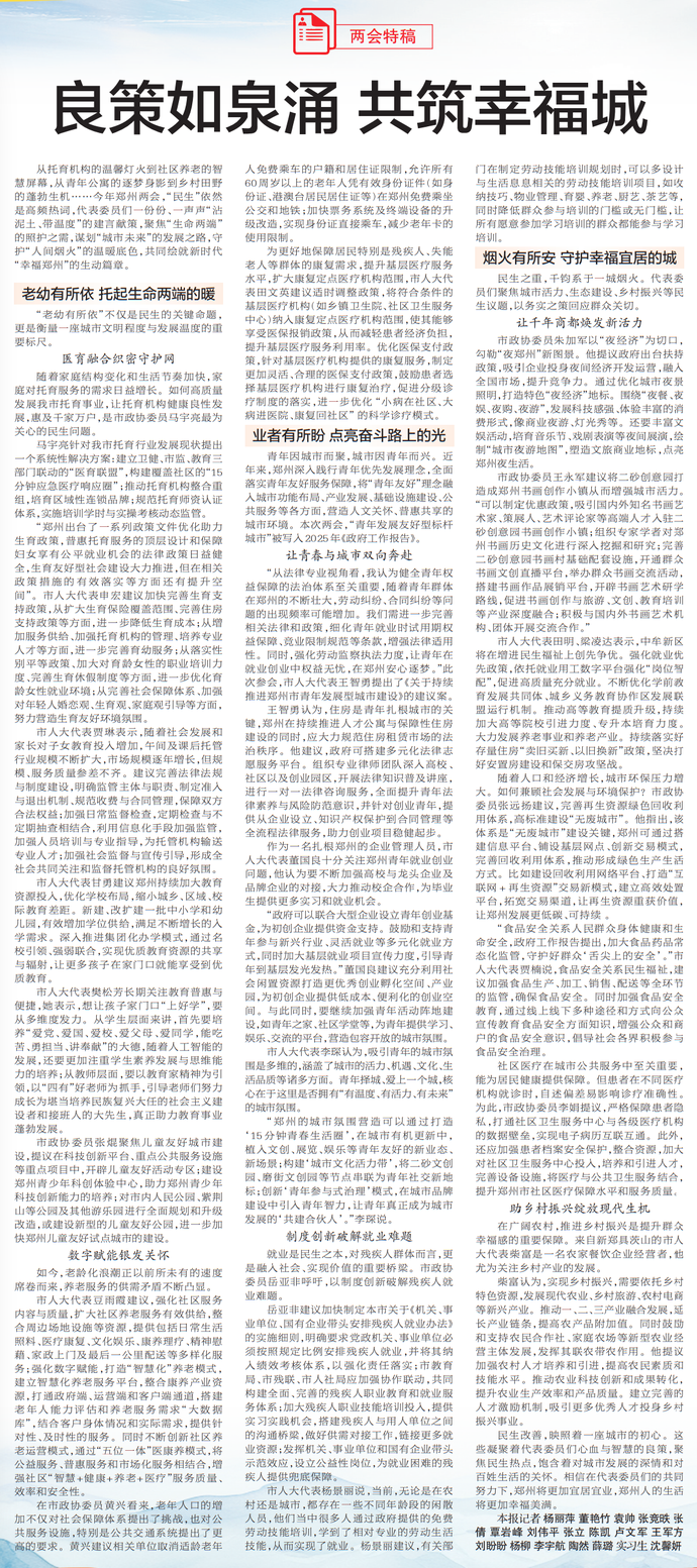 从托育机构的温馨灯火到社区养老的智慧屏幕,从青年公寓的逐梦身影到乡村田野的蓬勃生机……今年郑州两会,“民生”依然是高频热词,代表委员们一份份、一声声“沾泥土、带温度”的建言献策,聚焦“生命两端”的照护之需,谋划“城市未来”的发展之路,守护“人间烟火”的温暖底色,共同绘就新时代“幸福郑州”的生动篇章。(今日《郑州日报》7版)