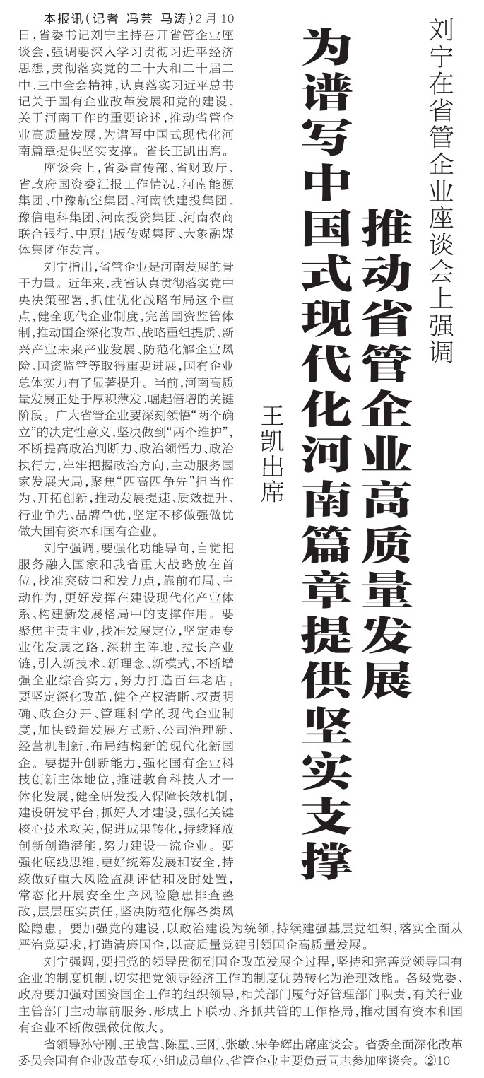 2月10日,省委书记刘宁主持召开省管企业座谈会,强调要深入学习贯彻习近平经济思想,贯彻落实党的二十大和二十届二中、三中全会精神,认真落实习近平总书记关于国有企业改革发展和党的建设、关于河南工作的重要论述,推动省管企业高质量发展,为谱写中国式现代化河南篇章提供坚实支撑。省长王凯出席。(今日《河南日报》1版)
