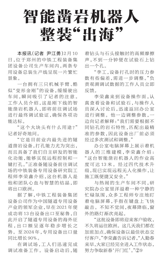 一台拥有三只机械手臂、酷似“变形金刚”的设备,缓缓驶出车间,瞬间吸引了记者的注意。工作人员介绍,这是刚下线的智能凿岩机器人,即将前往调试场进行最终调试验证,确保各项功能达标。(今日《河南日报》1版)