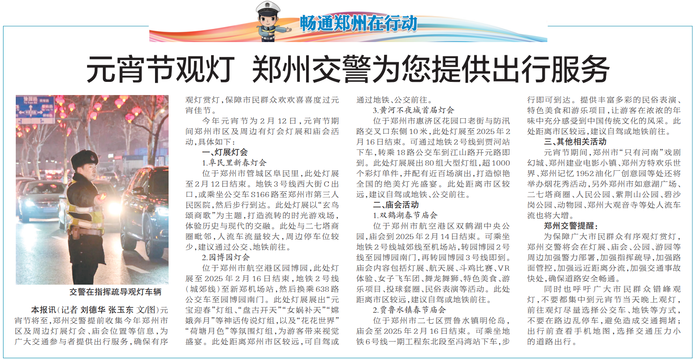 元宵节将至,郑州交警提前收集今年郑州市区及周边灯展灯会、庙会位置等信息,为广大交通参与者提供出行服务,确保有序观灯赏灯,保障市民群众欢欢喜喜度过元宵佳节。(今日《郑州日报》8版)