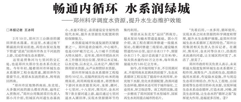 2月10日,郑州万三公路旁的圃田泽碧水荡漾。在这里,水通过地下箱涵流向泵站前池,再经由泵站及地下管道“逆流”回郑州市各主干河流的上游,完成市域生态水循环。(今日《河南日报》3版)
