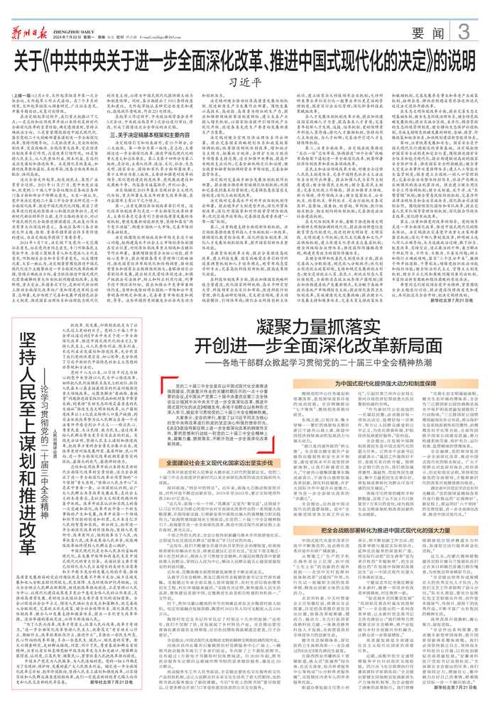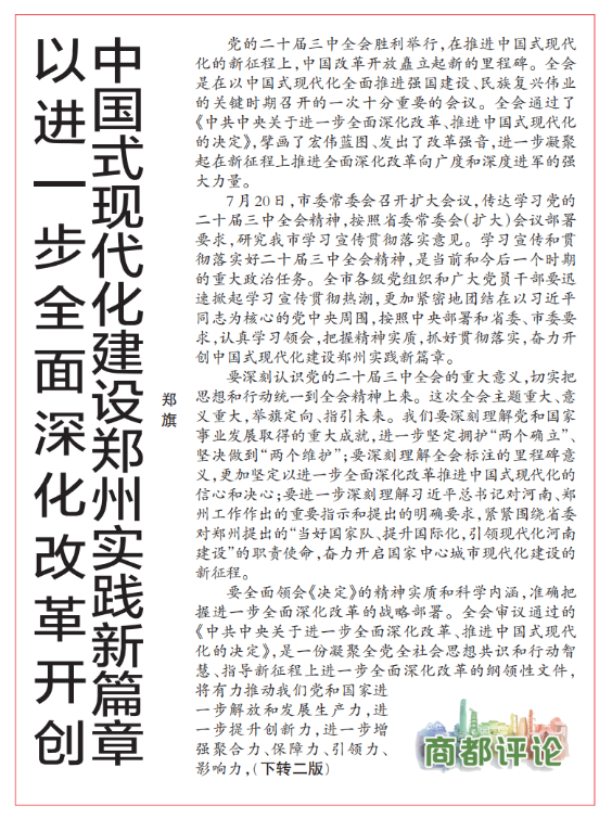 党的二十届三中全会胜利举行,在推进中国式现代化的新征程上,中国改革开放矗立起新的里程碑。全会是在以中国式现代化全面推进强国建设、民族复兴伟业的关键时期召开的一次十分重要的会议。全会通过了《中共中央关于进一步全面深化改革、推进中国式现代化的决定》,擘画了宏伟蓝图、发出了改革强音,进一步凝聚起在新征程上推进全面深化改革向广度和深度进军的强大力量。(今日《郑州日报》1版、2版)