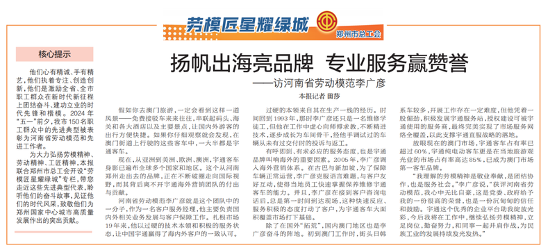 为大力弘扬劳模精神、劳动精神、工匠精神,本报联合郑州市总工会开设“劳模匠星耀绿城”专栏,带您走近这些先进典型代表,聆听他们的奋斗故事,见证他们的时代风采,致敬他们为郑州国家中心城市高质量发展作出的突出贡献。