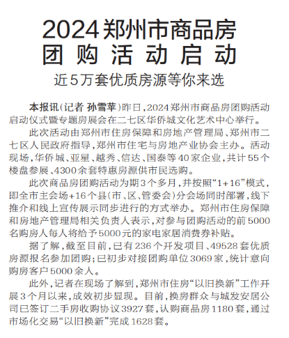 昨日,2024郑州市商品房团购活动启动仪式暨专题房展会在二七区华侨城文化艺术中心举行。(今日《郑州日报》2版)